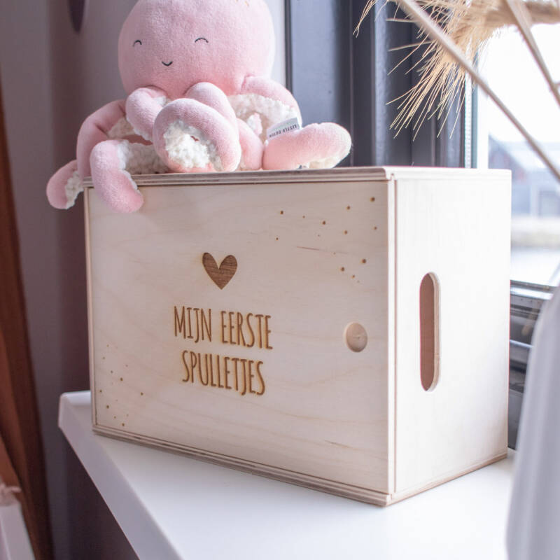 In deze leuke houten kist kan je alle eerste spulletjes bewaren! Mooi en bij elkaar opgeborgen.